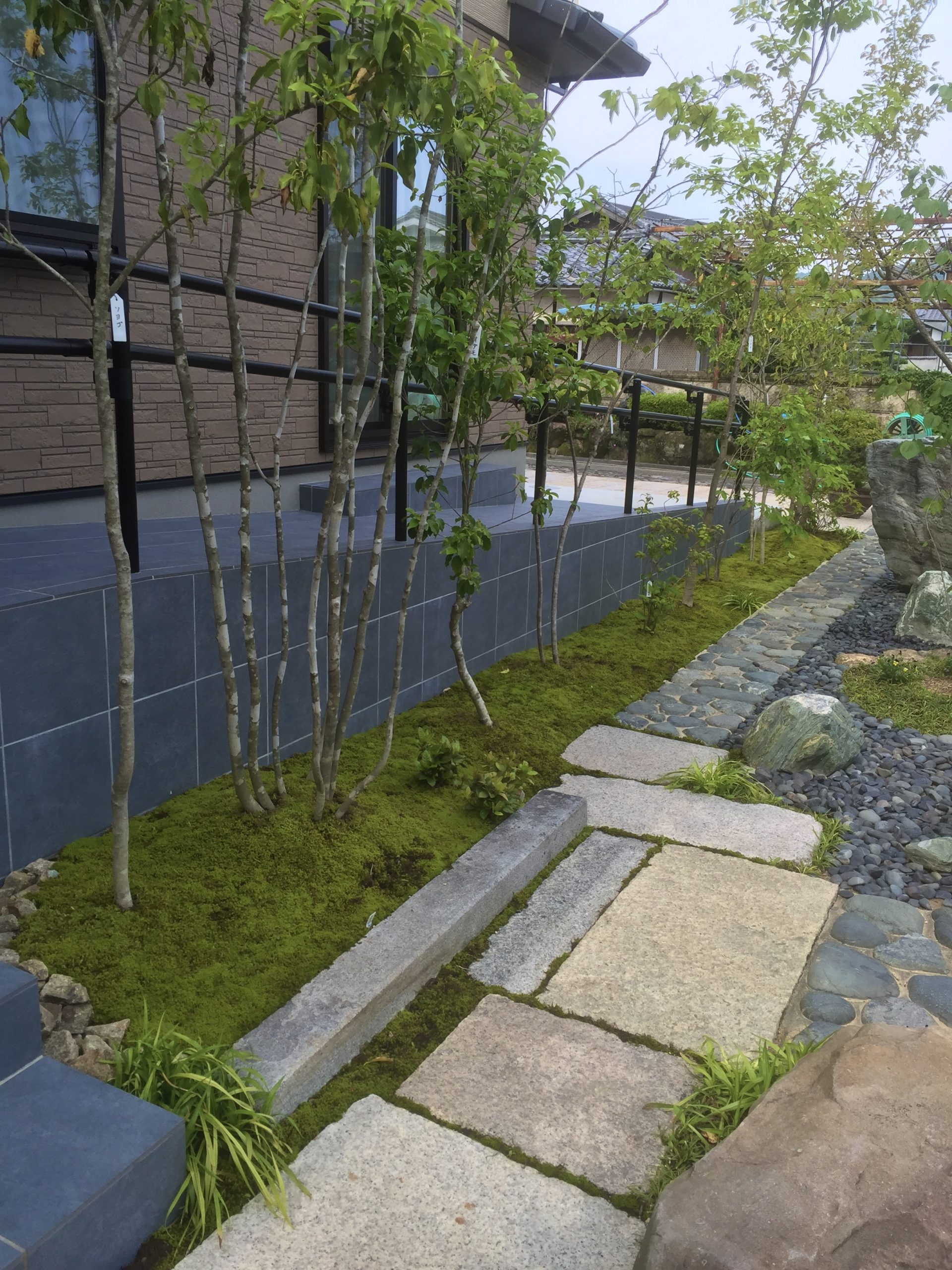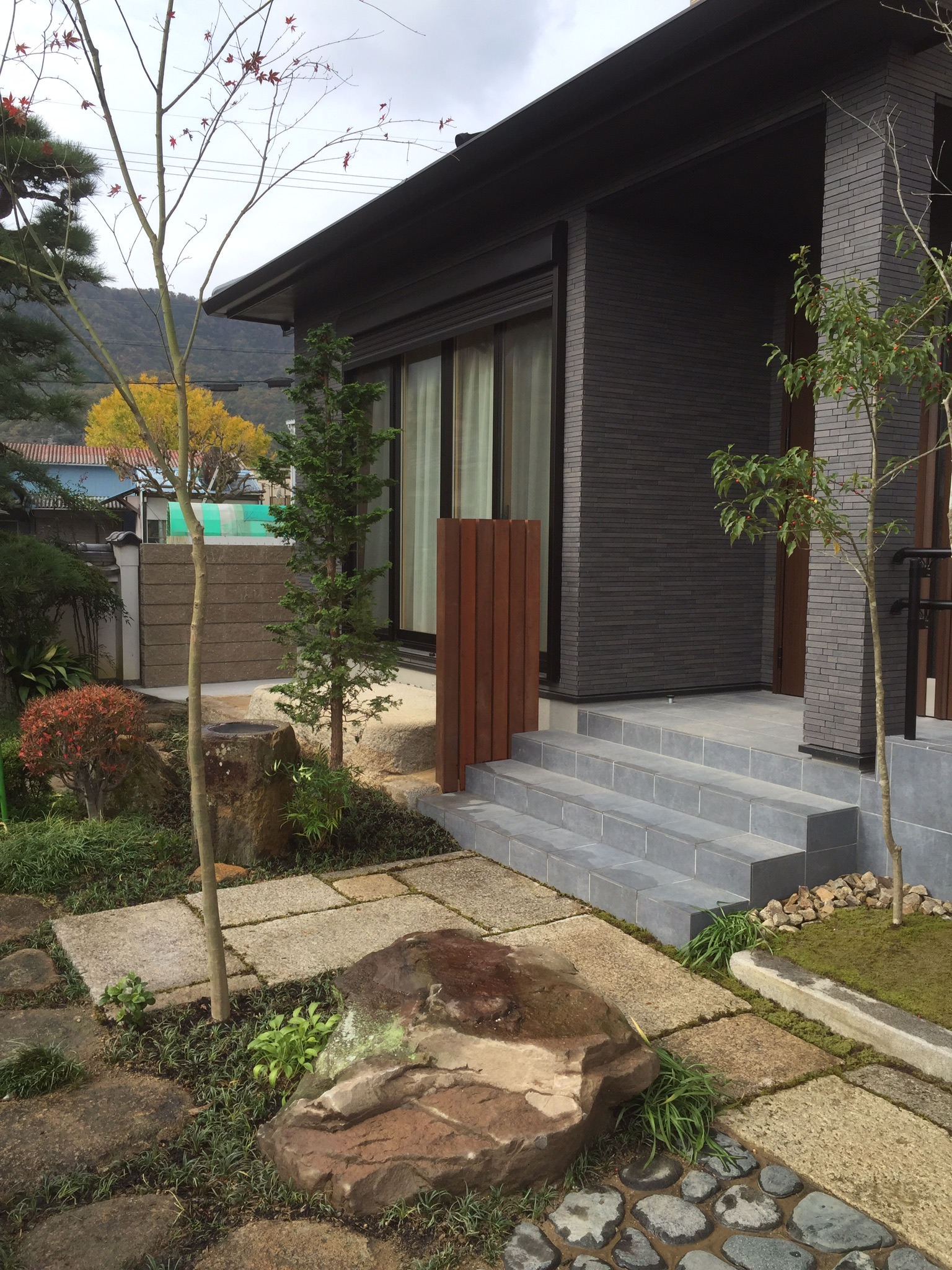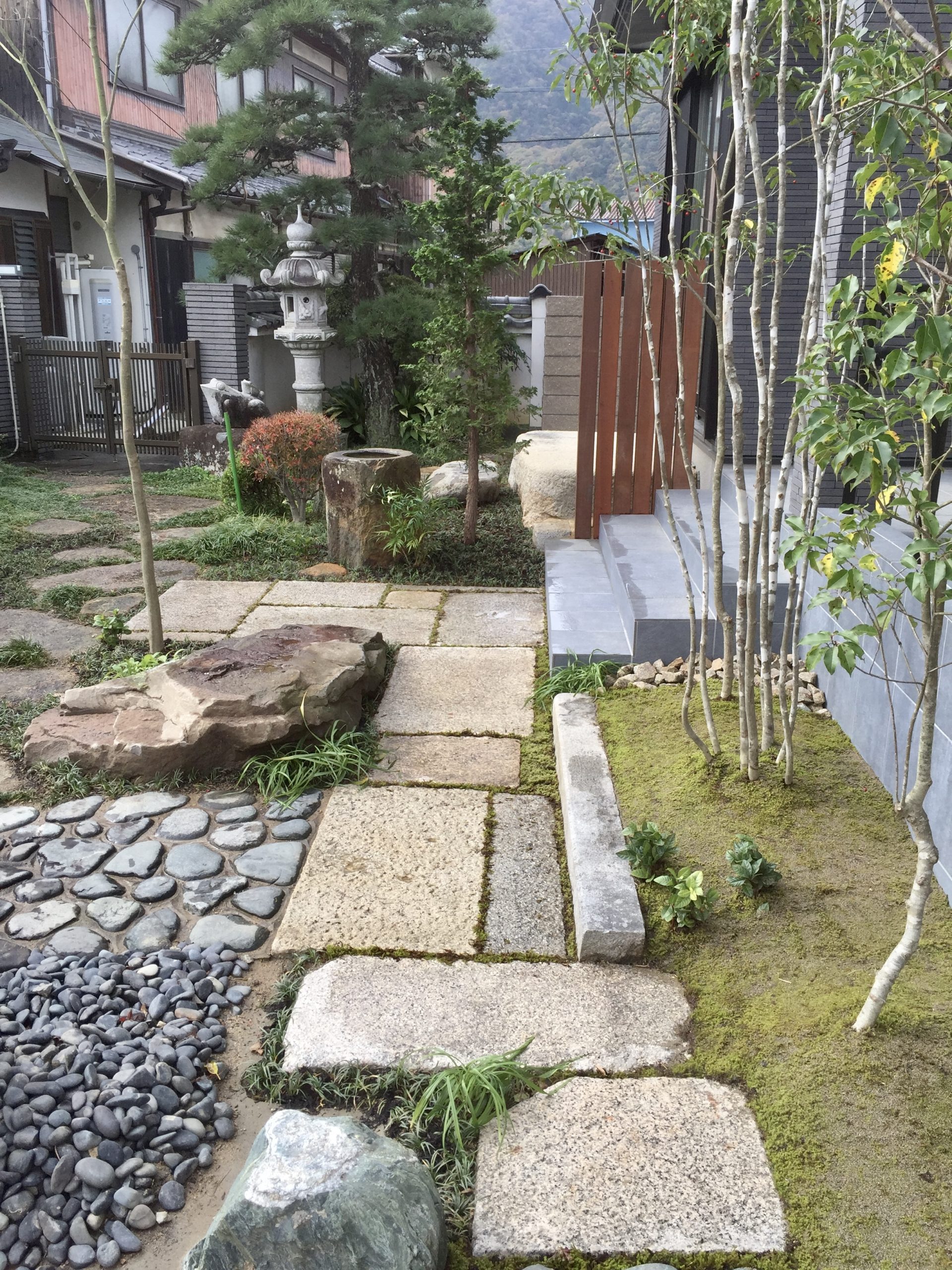 また玄関への通路は古板石で仕上げ、既存の庭に溶け込むよう施工しております。