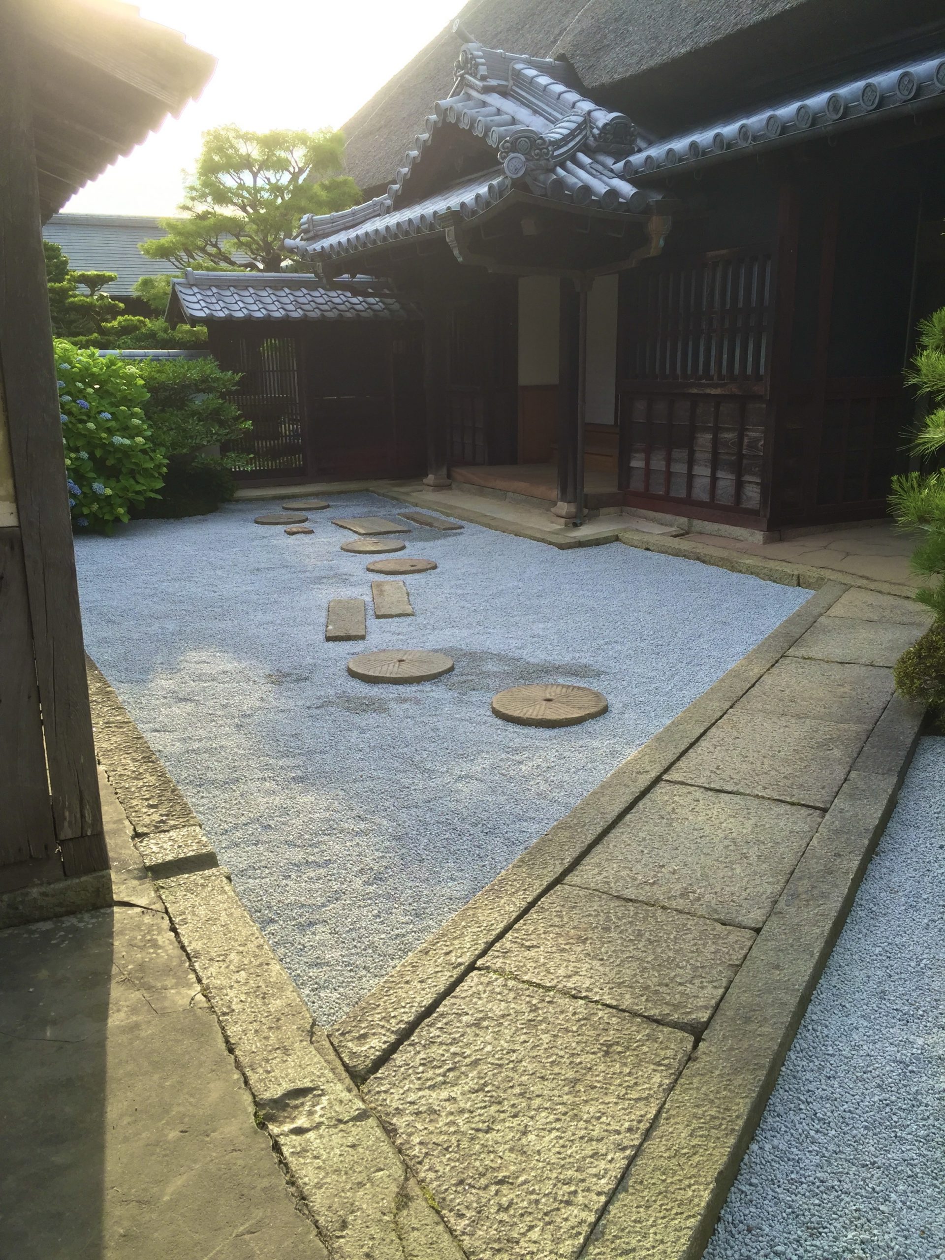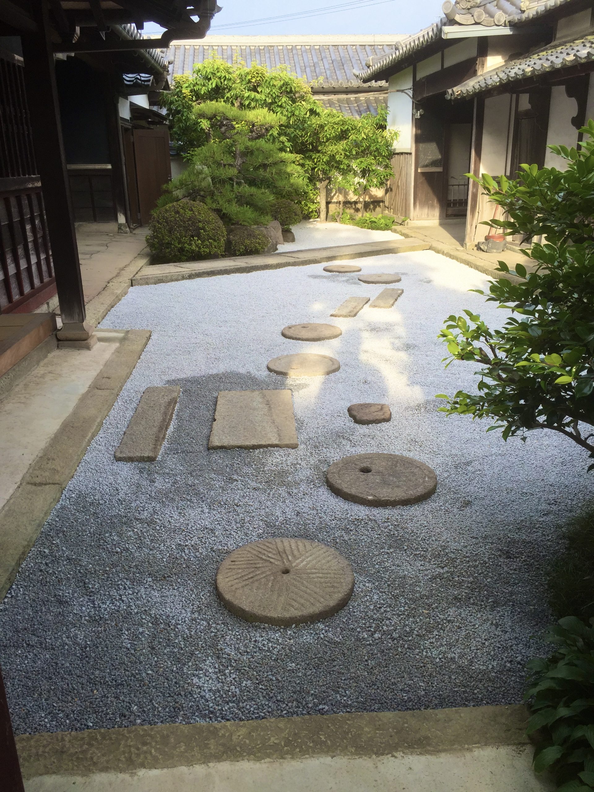 本玄関脇の土のままの一画を砂利敷きにし、その間を縫う様に飛石が打ってあります
