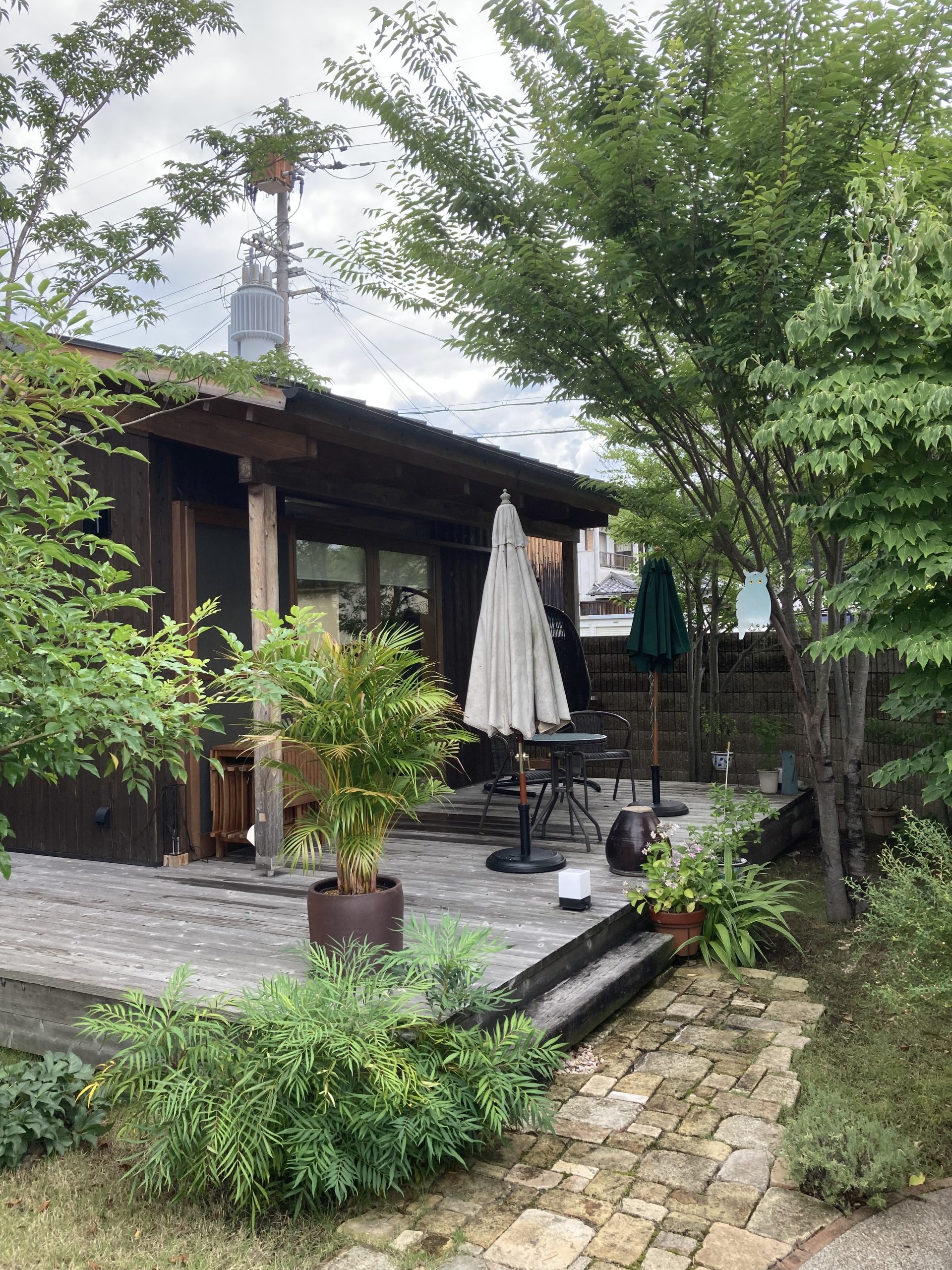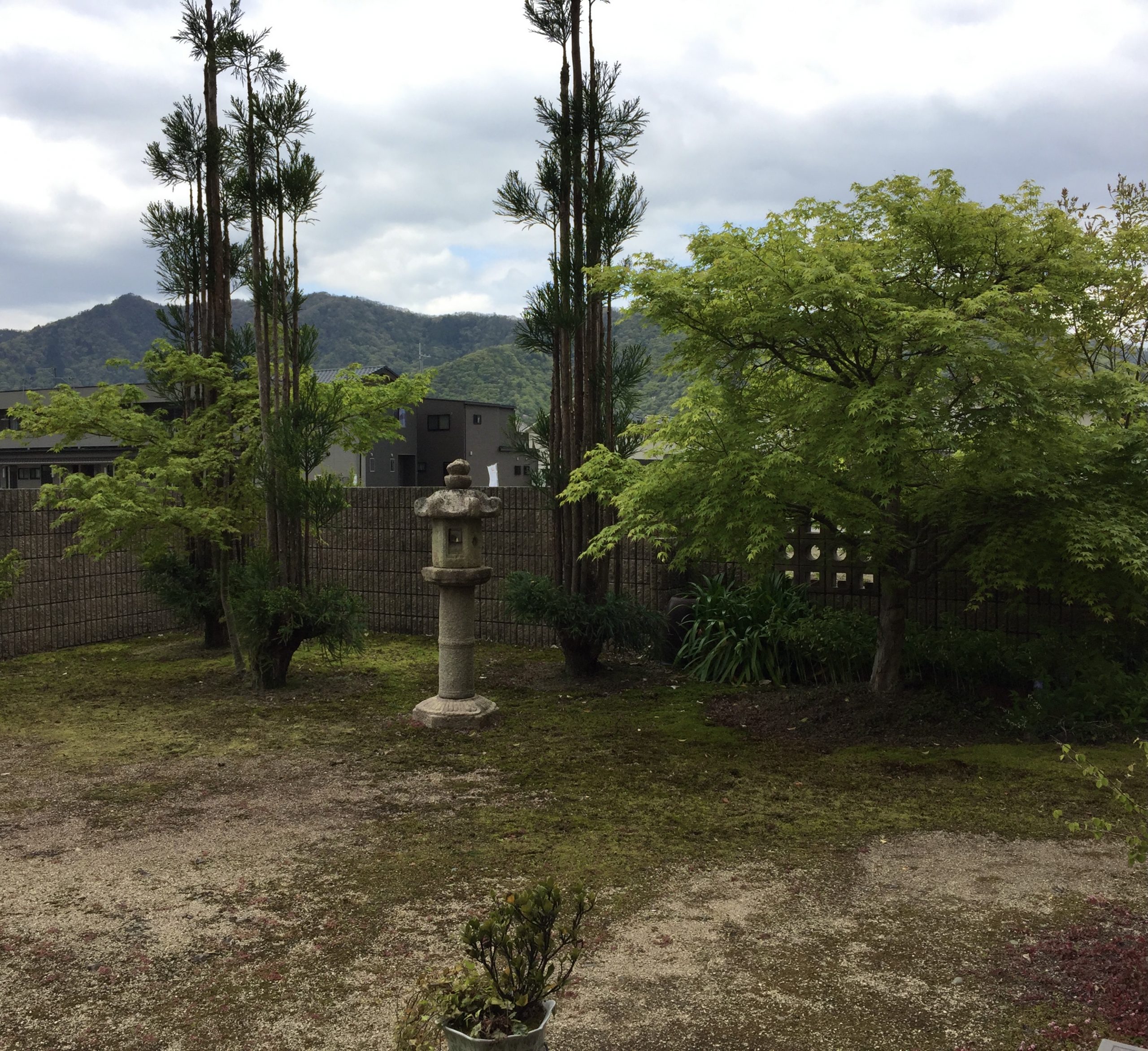 既存の園路からのつなぎは耐火古レンガで創作し、また母家和室前には御影石製の寄せ燈篭を据えて景観を引き締めてあります
