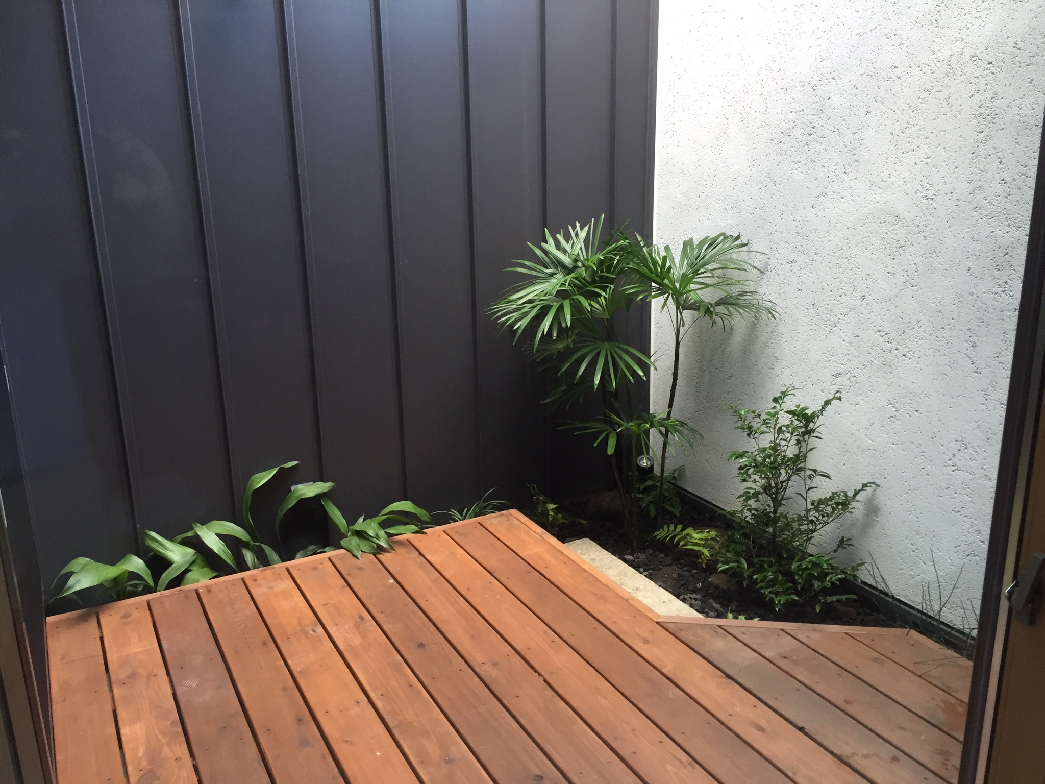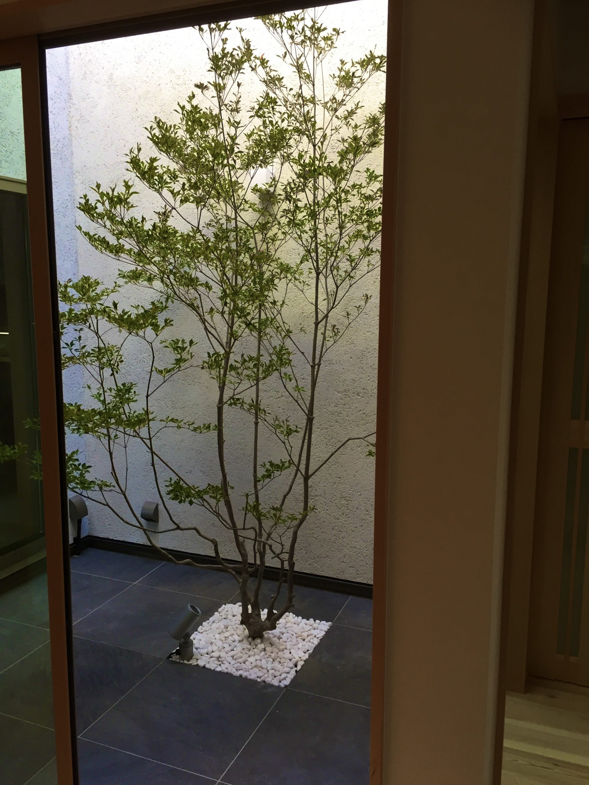 一つはタイル敷の中に幅60cmの植桝を設けた場所で、一本だけで四季が感じれる様ドウダンツツジが植えてあります
