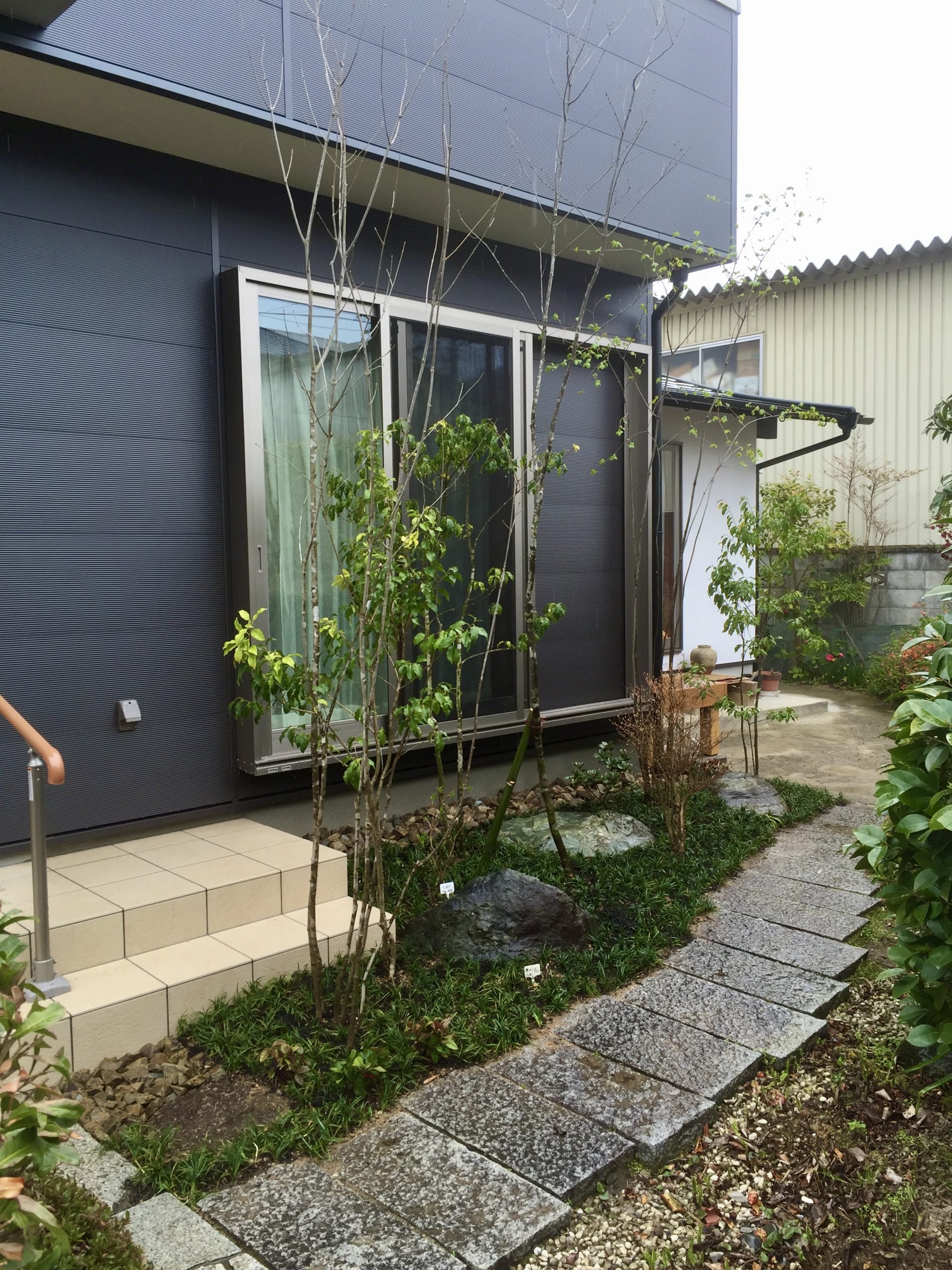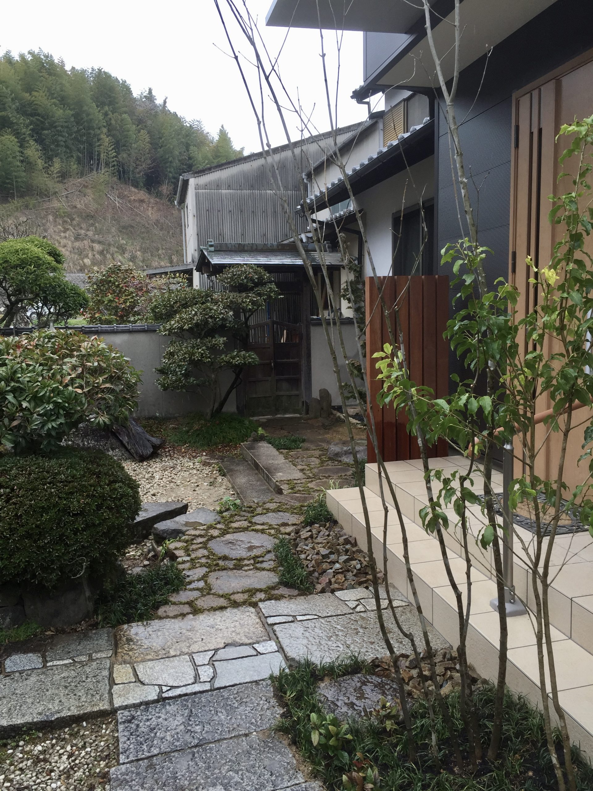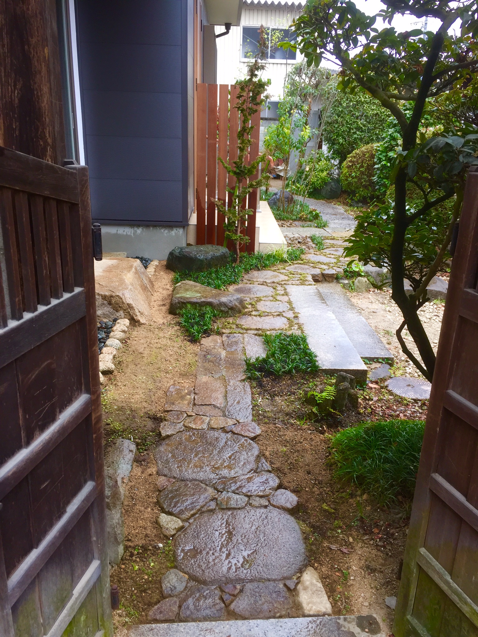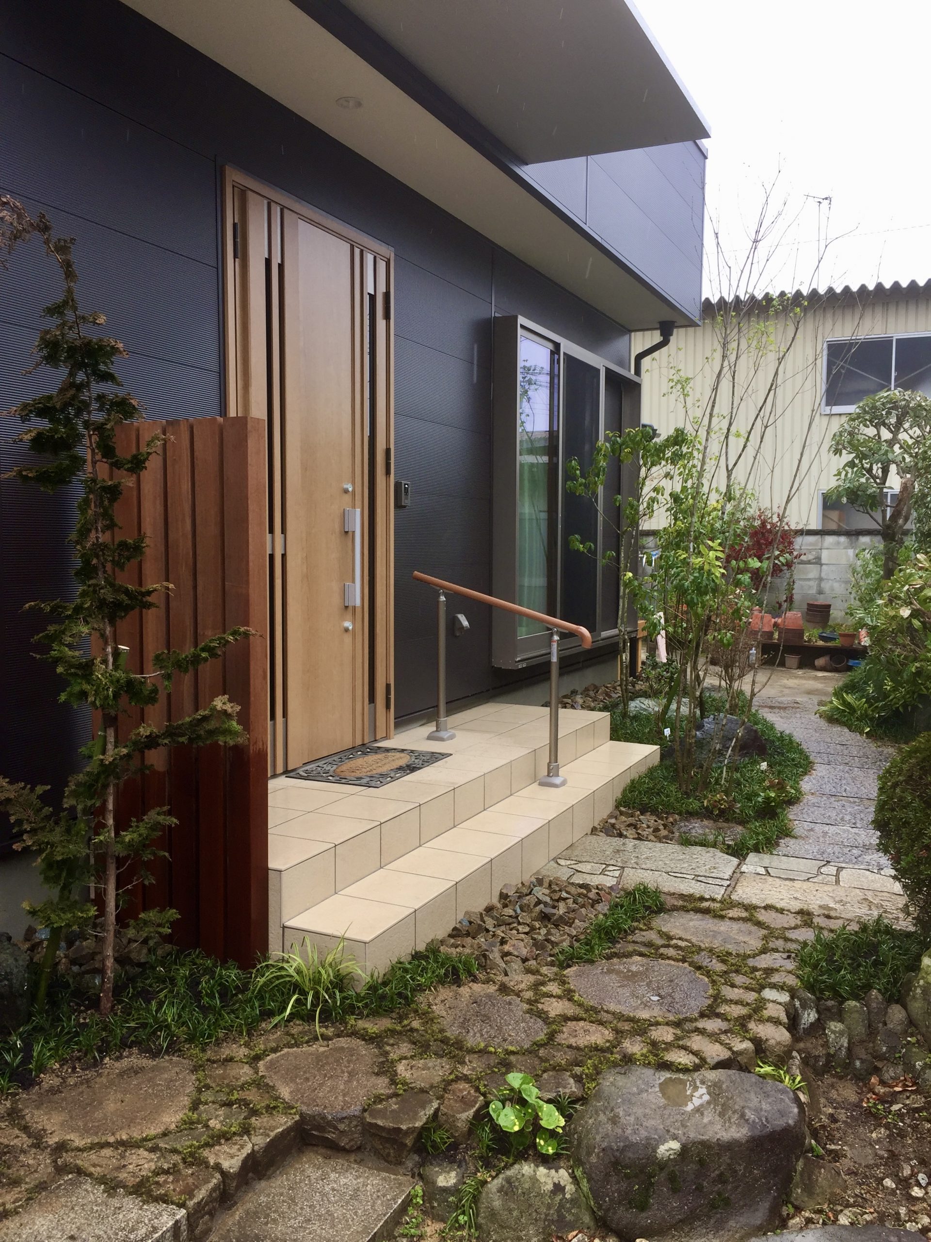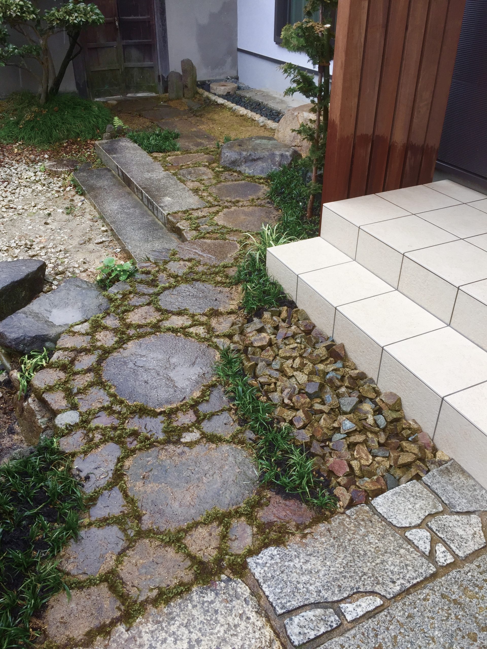 また玄関踊り場脇をウリン材で袖垣を創り、既存の飛石は栗石で畳み苔目地仕上げで一体化し、歩きやすく補修してあります。