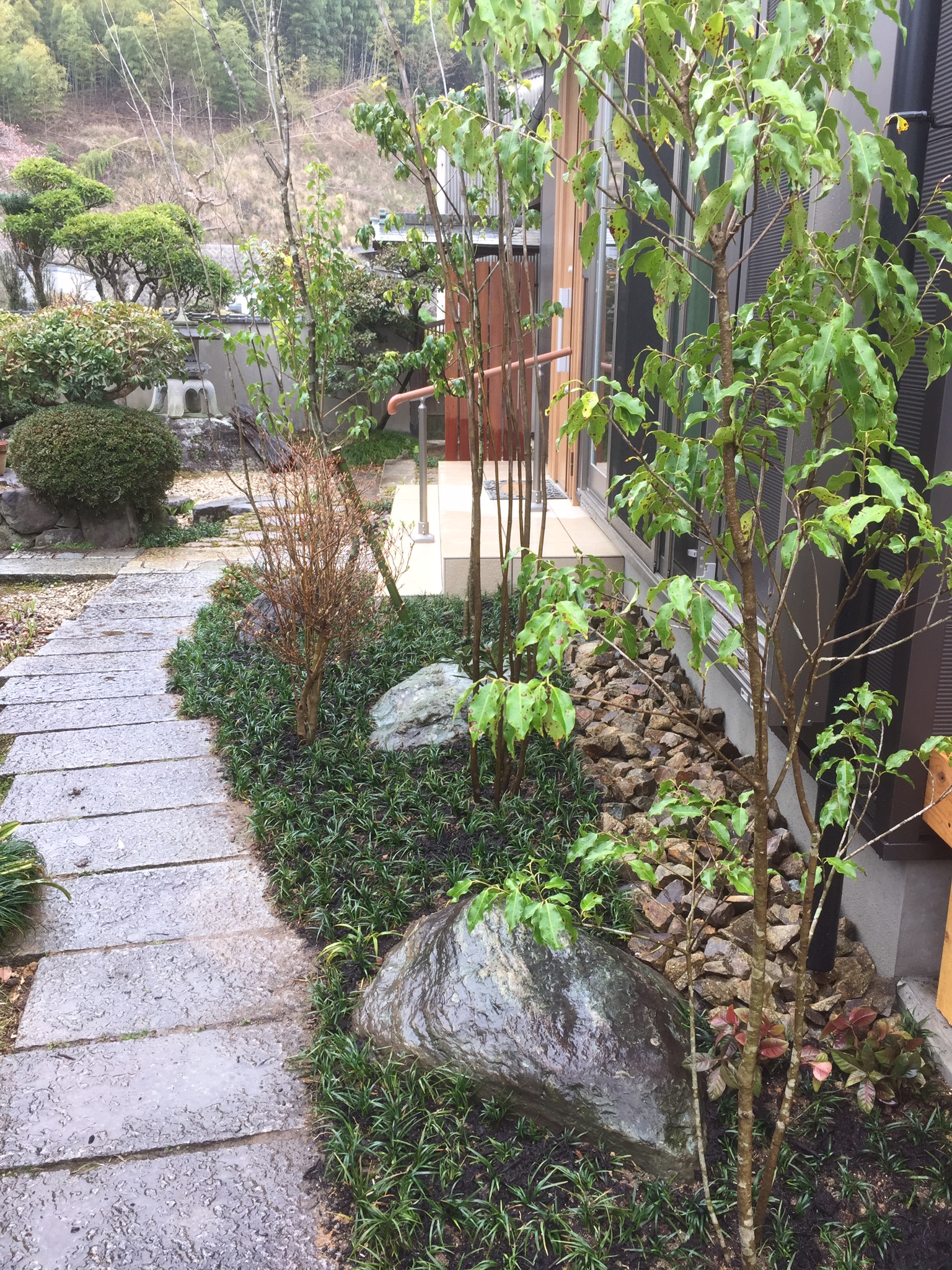 リビング前に枝先の柔らかい落葉樹とソヨゴを寄植えし、根元は玉竜で仕上げてあります。