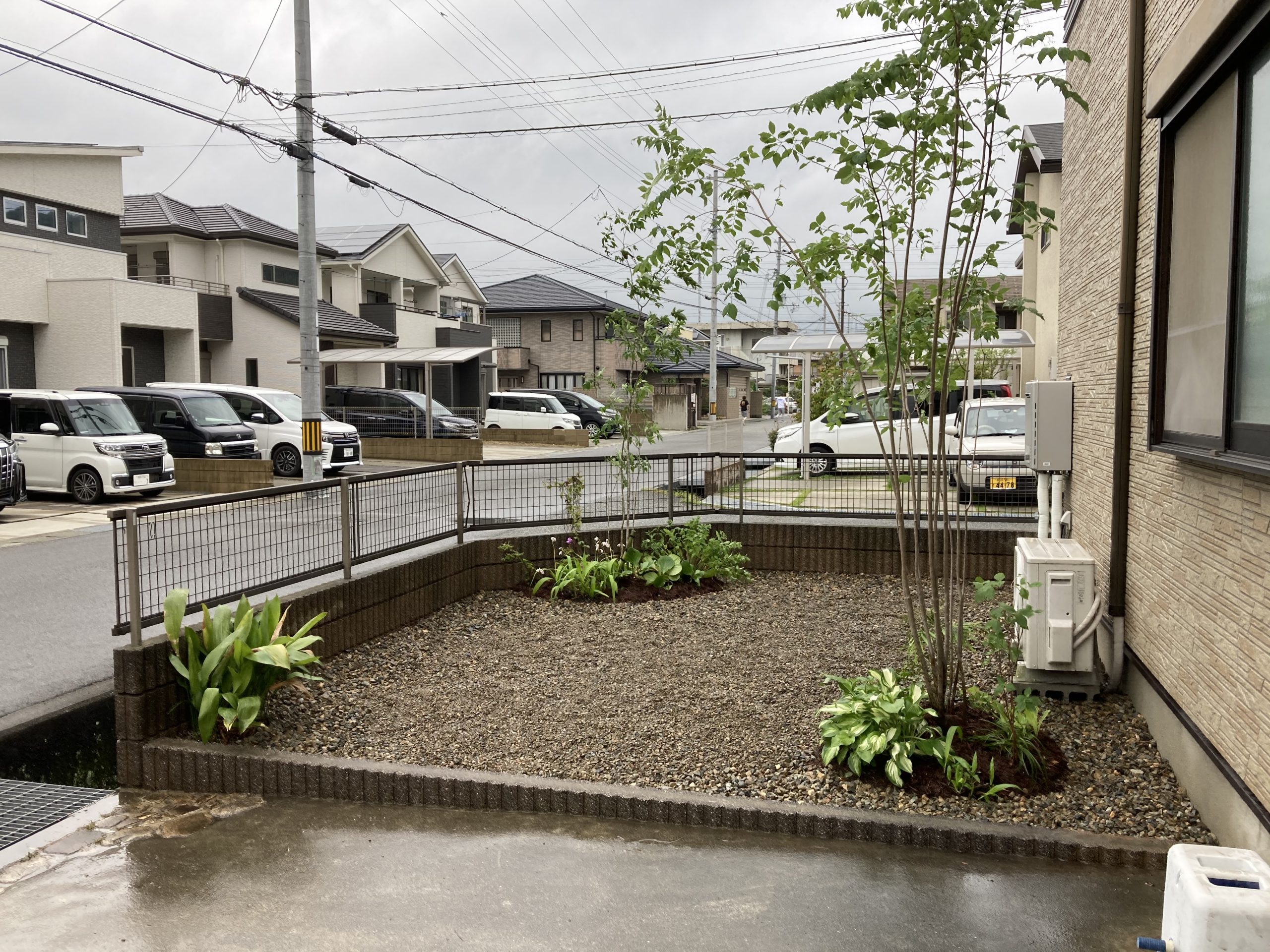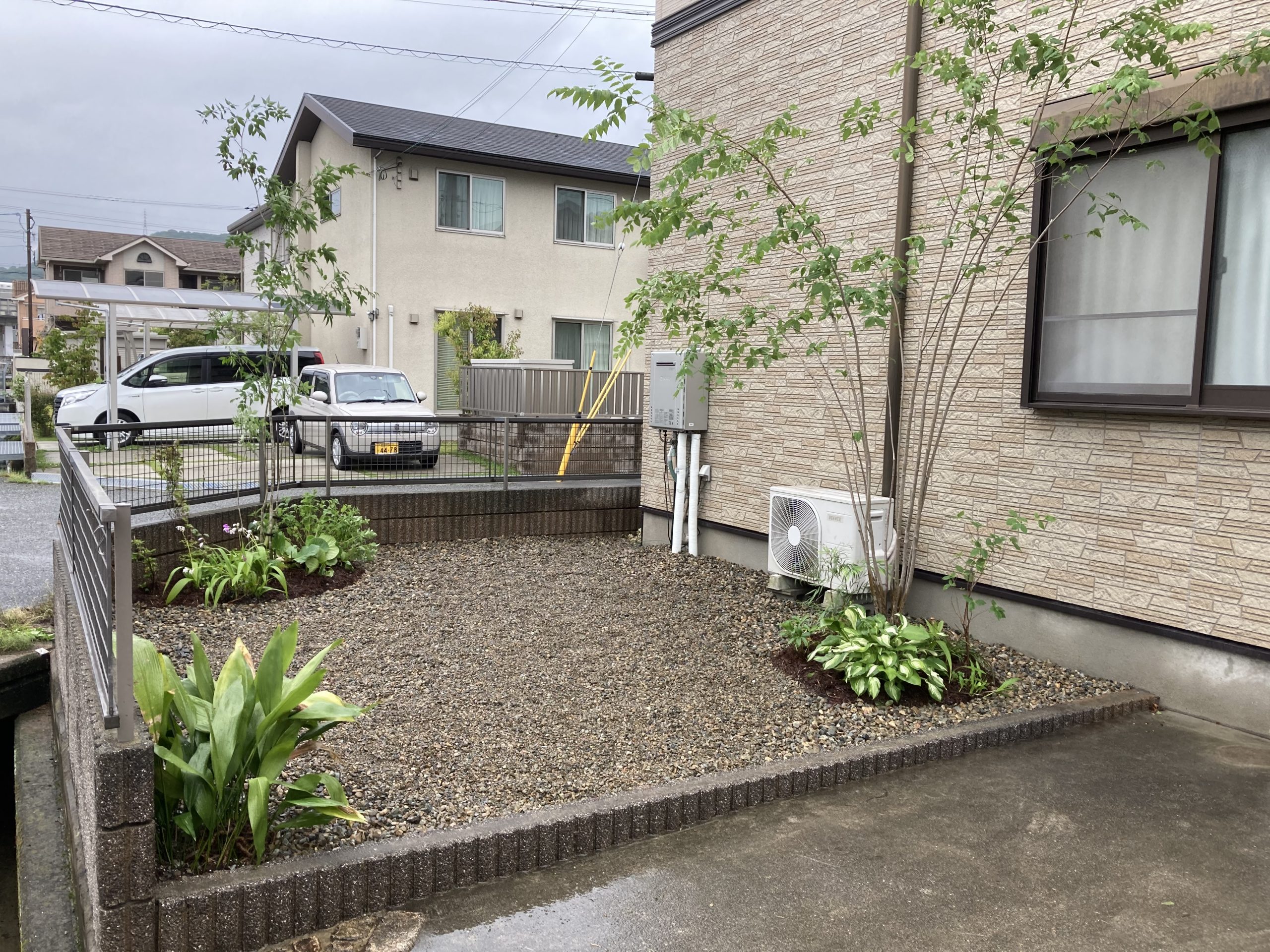 揖保川砂利微利仕上げ、下地防草シート敷き