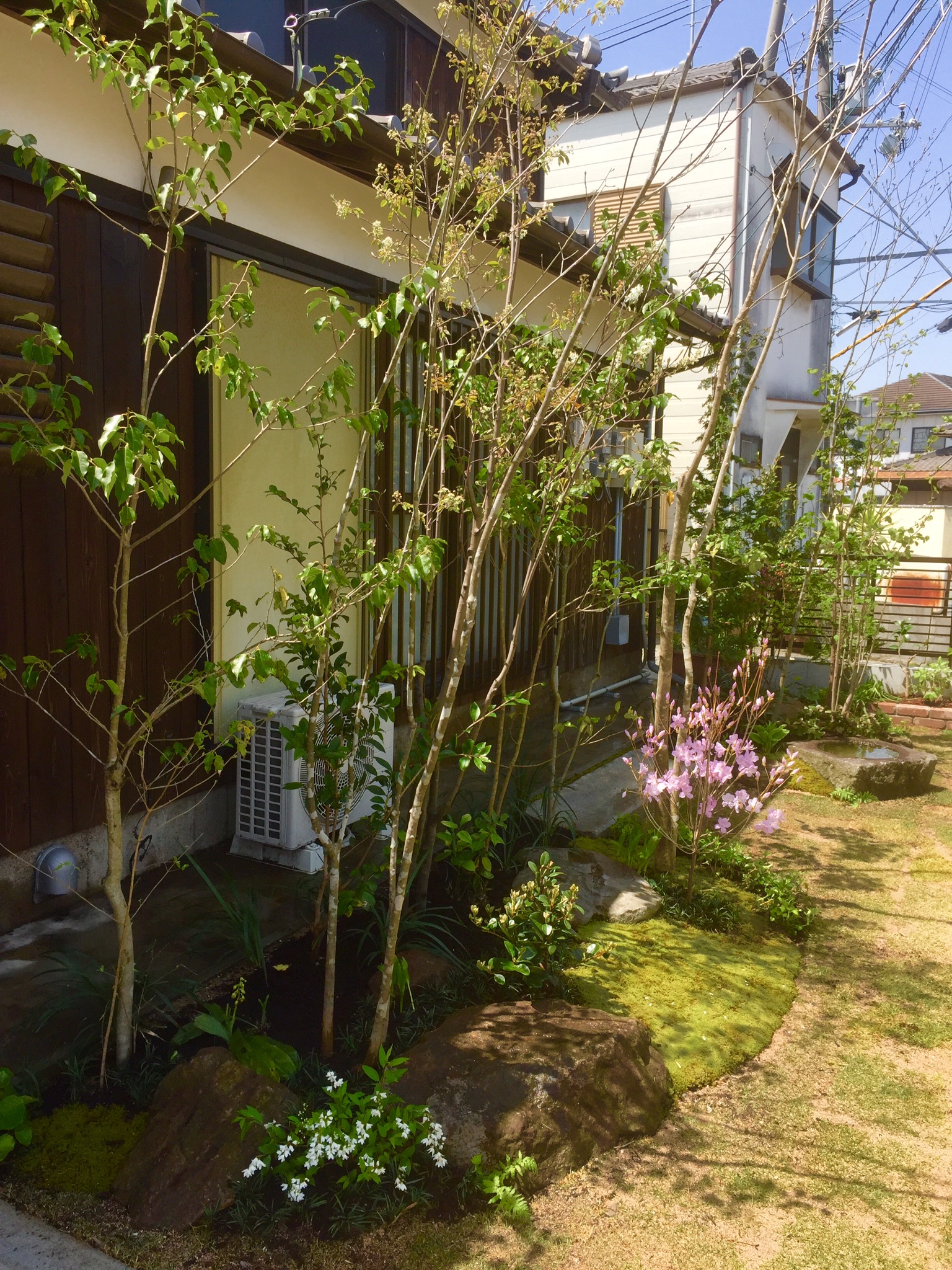 ソヨゴ、チャボヒバ、サカキ、ヒサカキなどいつもより少し多めの常緑樹を雑木と寄植えし冬でも緑が楽しめるように配慮してあります