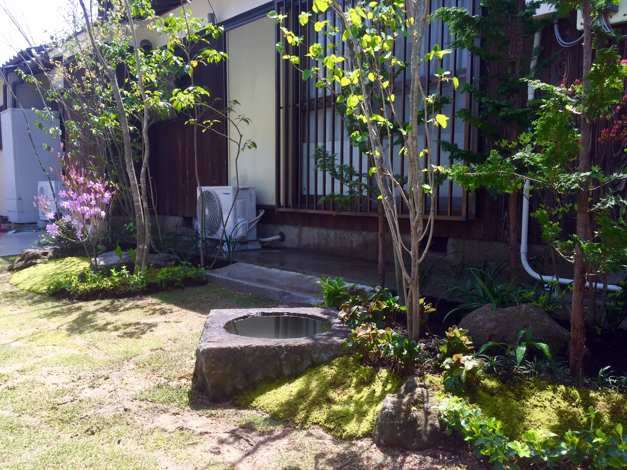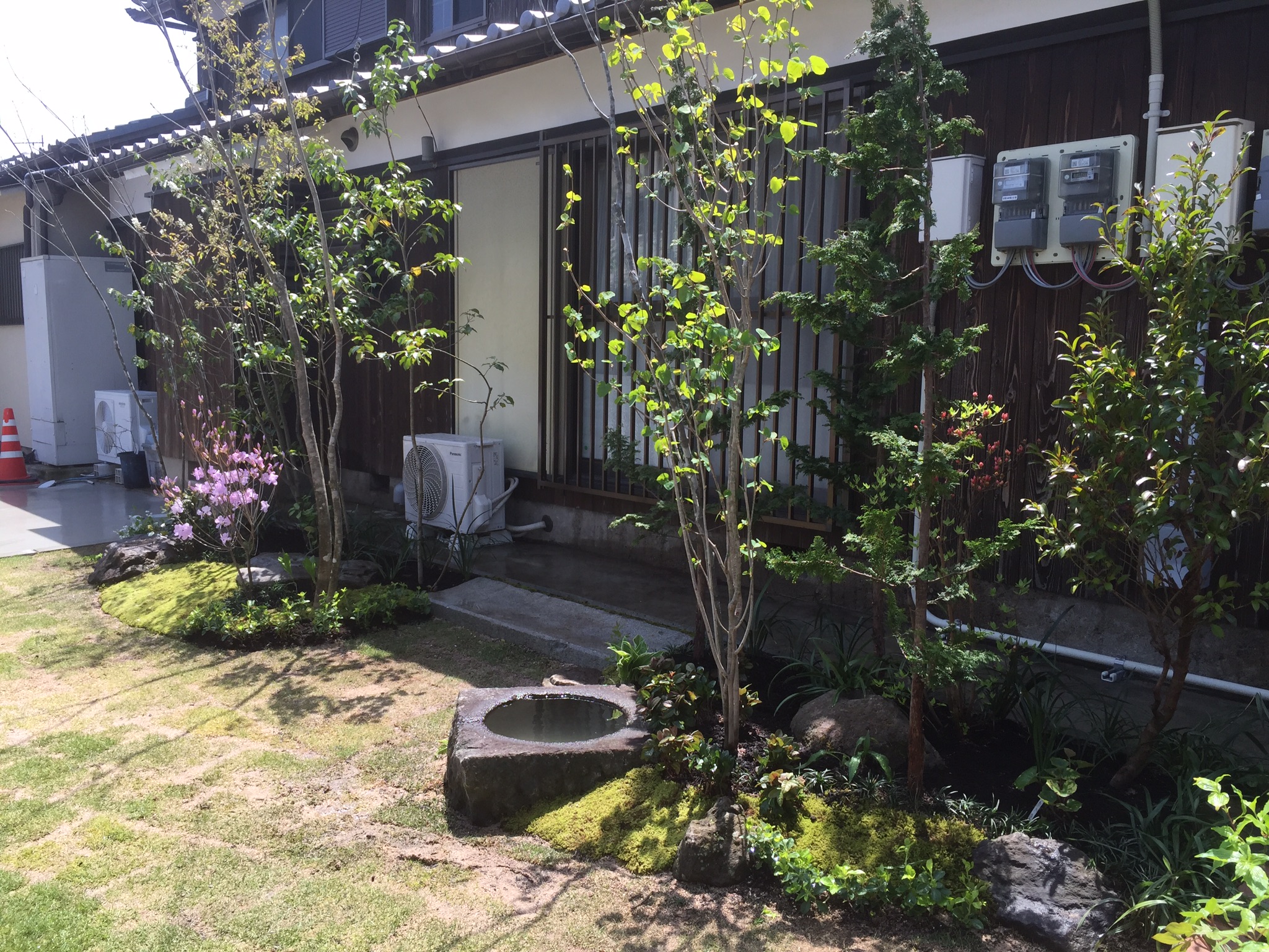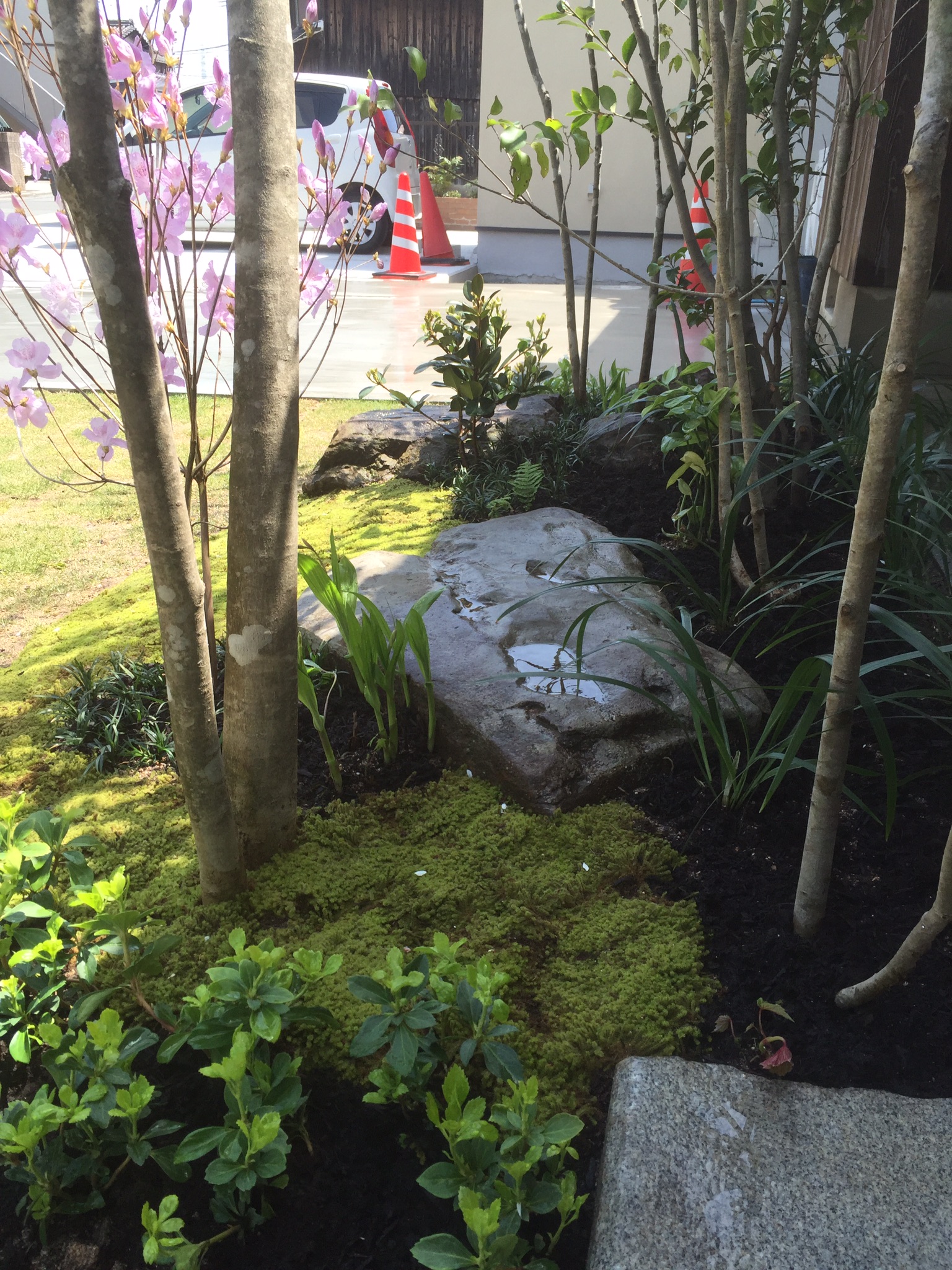 道を通られる方にも鑑賞して頂くべく水鉢を点景にマウンド二箇所創り幅のある延石で繋いでいます。